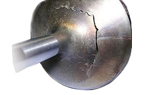 HomeResourcesValve Failure AnalysisBreakage - thermal overstressFailure caused by wide variations of temperature and pressure within the combustion chamber.Result Valve head breaks, along a chord of its circle, by the under head radius (the fracture starts with a fissure in the radius). cause Very high pressures and temperatures in the combustion chamber. (These problems are mainly associated with the exhaust valves). contributing factors Engine overspeed. Valve float. Weak valve springs. High seating speed. Abnormal combustion. Incorrect fuel. Result A radial crack inward from the margin. If the fissure advances, the head will break. cause Thermal fatigue due to high temperatures and unequal temperatures in different zones of the valve head. contributing factors Thermal shock. Engine overload. Excessive combustion temperature and pressure. Weak valve springs. Seating velocity too high. Mechanical overstressFailure caused by mechanical origin. This includes wear and breakage, which has nothing to do with the combustion chamber environment.Result Valve head to stem breakage. cause Repeated stem stress. contributing factors Weak springs. Valve float. Engine over speed. Seating velocity too high due to excessive lash. Incorrect valve train clearance. engine over speed, especially on valves with rectangular keeper grooves. Result Valve stem breakage in the keeper groove area. cause Material fatigue due to mechanical hardening on the surface. It occurs on the contact zone between grooves and keepers. contributing factors Defective keeper assembly. Keeper groove damages. Valve float. Excessive valve train clearance. Engine over speed, especially on valves with rectangular keeper grooves. BreakageImpact failureCharacteristic appearance of an impact failure. NOTE: Breakage by impact is a sudden failure. (example: Piston / Valve colli-sion).valve burningResult Valve face burnt and torched cause Excessive localized heat in the valve head, distortion and seat leakage (poor seating). contributing factors Lack of stem to guide clearance. Worn valve guide and/or misalignment of valve stem and guide. Pre-ignition (lean air fuel mixture, incorrect fuel). Improper compression ratio. Defective cooling system. f Incorrect lash adjustment. Excessive carbon build up on valve. Fatigue failureCharacteristic appearance of a fatigue failure. NOTE: Breakage by material fatigue happens after thousands of cycles, starting in a small defect and advancing until breakage occurs.valve face pittingResult Pitted valve and valve seal faces. cause Solid particles pressed between valve face and valve seat. contributing factors excessive oil consumption (through piston rings, valve guides and valve stem seals). Abnormal combustion. Long idle periods. Thermostat malfunction (below normal engine temperature).
